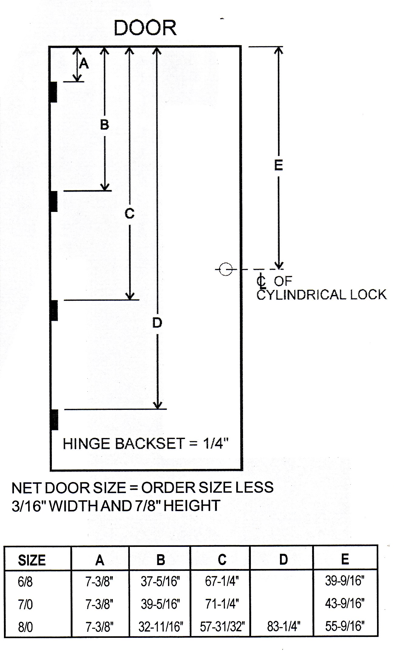 Manufacturers 6 8 7 0 8 0 1st hinge 2nd hinge 3rd hinge strike 1st hinge 2nd hinge 3rd hinge strike 1st hinge 2nd hinge 3rd hinge 4th hinge strike amweld 7 1 2 37 7 16 67 3 8 39 11 16 7 1 2 39 7 16 71 3 8 43 11 16 7 1 2 32 13 16 58 1 8 83 7 16 55 11 16 ceco 6 3 4 37 3 4 68 3 4 38 3 16 6 3 4 39 3 4 72 3 4 42 3 16 6 3. 8 0 frames have a 4th hinge. However manufacturers do periodically revise their hinge and strike spacing therefore the sdi strongly recommends that individual manufacturers be contacted. C o m measure from the top of the door to the top of each hinge cut out cl measure from the top of the door to the center line of the lock cut out cl e note.